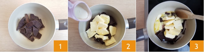 Para preparar los cuadritos de chocolate y jengibre, lo primero es preparar la base: cortad el chocolate en trozos 1 y colocadlo en un cazo con la mantequilla y 30 g de leche 2. Llevad al fuego y derretid a fuego bajo 3 mientras removéis con una cuchara de madera.