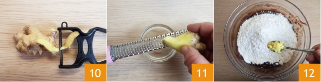 Pelad el jengibre fresco usando un pelador de verduras 10 o un cuchillo pequeño y ralladlo 11. Añadidlo a la masa y mezclad 12.