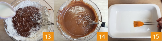 Por último, incorporad los 100 g restantes de leche 13 y mezclad muy bien, usando siempre el batidor de mano, hasta obtener una mezcla lisa y homogénea 14. Coged una fuente de horno rectangular de 30x20 cm y pinceladla con un poco de aceite 15, solo para que se adhiera el papel de horno.