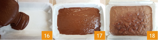 Forrad el molde con el papel de horno ajustado, verted dentro la mezcla 16, nivelad con una espátula 17 y hornead en el horno estático precalentado a 170°C durante 35 minutos. Haced la prueba del palillo, sacad del horno y dejad enfriar 18.
