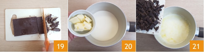 Mientras tanto, preparad la ganache de chocolate para glasear la tarta. Picad el chocolate negro 19. Verted en un cazo la nata y añadid la mantequilla en trozos 20. Calentad a fuego moderado hasta que esté a punto de hervir. Retirad del fuego y añadid el chocolate picado 21.