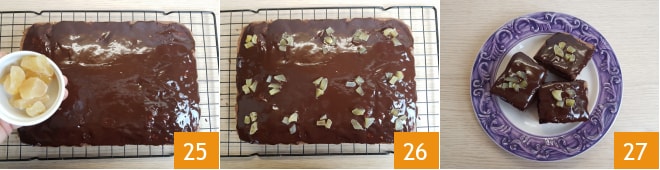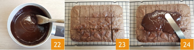 Mezclad todo con vigor, para que el chocolate se derrita completamente 22. Dejádlo enfriar unos 30 minutos a temperatura ambiente, para que el glaseado tome consistencia. Retomad la tarta, sacadla del molde eliminando el papel de horno y ponedla sobre una rejilla. Cortadla primero en tres partes horizontalmente y luego en otras 5 partes en sentido vertical, para obtener 15 cuadritos de aproximadamente 5 cm 23. Verted encima la ganache y extendédla por toda la superficie de la tarta con la espátula 24.