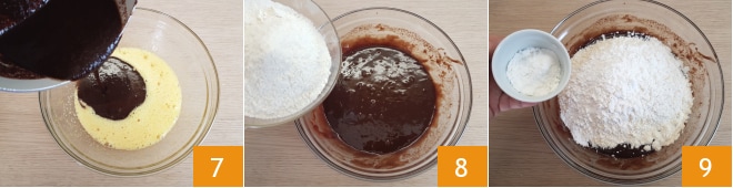 Agregad la mezcla de chocolate y mantequilla enfriada y mezclad bien 7. Incorporad la harina 8, la fécula y la levadura en polvo para dulces 9.