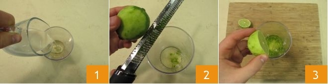 Para preparar el cuoppo de mar con mayo al mojito, empezad realizando esta última. En el vaso de una batidora, verted el aceite, la leche de soja 1, la sal, luego rallad la cáscara de lima 2 y exprimid el jugo de una mitad 3.