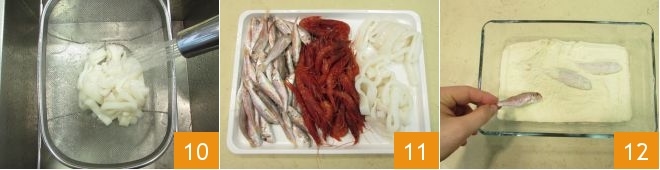 y finalmente los aros de calamar 10. Colocadlos en una bandeja 11. Poned a calentar abundante aceite a 190° en una olla y mientras tanto enharinad en la sémola los salmonetes 12.