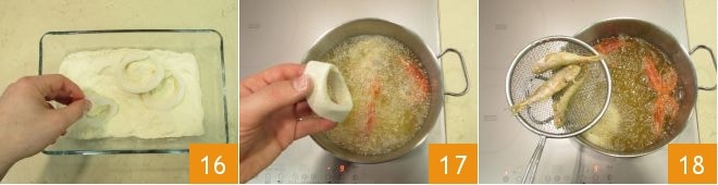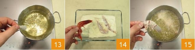 Poco a poco sumergid 5-6 piezas a la vez y dejad dorar durante un par de minutos 13. Continuad luego inmediatamente después enharinando las gambas 14 y sumergiéndolas en el aceite 15.