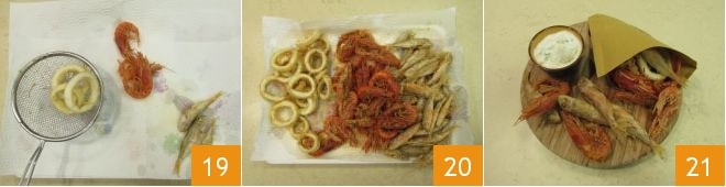 y luego escurrid en cuanto empiecen a dorarse 19. Escurrid en papel absorbente y luego continuad hasta terminar los ingredientes 20. Colocad en conos de papel de estraza y la falsa mayonesa en los boles: ¡aquí está listo el cuoppo de mar con mayo al mojito, servid muy caliente 21!