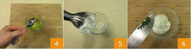 Añadid el ron 4 y obtened una crema densa utilizando una batidora de inmersión 5. Transferid a un bol, unid la menta que habréis picado a cuchillo 6.