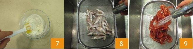 Mezclad y poned a un lado en el frigorífico 7. Mientras tanto, enjuagad bien los pescados, mejor si es uno a uno, entonces salmonetes 8, gambas 9,