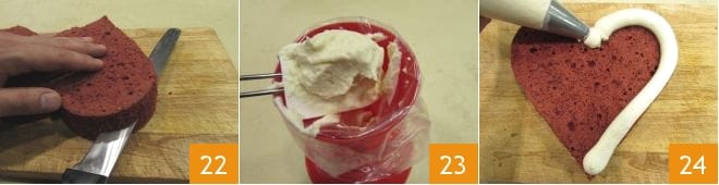 Una vez que estén completamente fríos, con un cuchillo largo retira unos 2 mm de la parte superior de los corazones (para eliminar la parte más oscura e irregular) 22 y resérvala: servirá para la decoración. Luego divide cada corazón a la mitad para obtener en total 4 bases. En este punto se puede rellenar la tarta: coloca la mousse de café en una manga pastelera con boquilla lisa 23 y rellena la primera base, distribuyendo la crema desde el borde hacia el centro 24.
