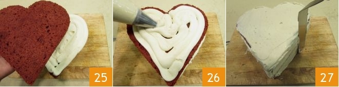 Cubre con otra base en forma de corazón 25 y continúa con una capa de crema, luego sigue con las otras dos bases y la crema hasta terminar con una capa de crema de café 26, distribuyendo la crema sobrante también en los bordes de la tarta con una espátula 27. Antes de pasar al resto de la decoración, coloca la tarta en el frigorífico durante 5-6 horas (o en el congelador durante 4 horas).