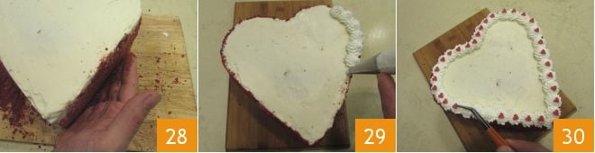Pasado el tiempo necesario, pica la capa superior de las bases que habías reservado y con el polvo obtenido, decora los lados del red velvet 28. Puedes completar la decoración del corazón a tu gusto: por ejemplo, hemos elegido hacer unos montones de nata montada creados con una manga pastelera con boquilla de estrella 29 y colocar corazones rojos de azúcar 30