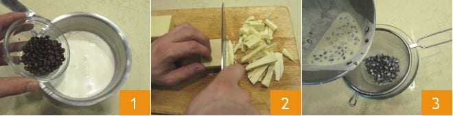 Para preparar el corazón red velvet con mousse de café, empieza con la mousse: en un cazo vierte 250 g de nata y los granos de café 1, luego colócalo al fuego y deja hervir suavemente durante 10 minutos. Apaga y deja en infusión al menos 1 hora. Pica el chocolate blanco groseramente 2 y reserva. Cuando el tiempo de infusión haya pasado, cuela la nata para eliminar los granos de café 3