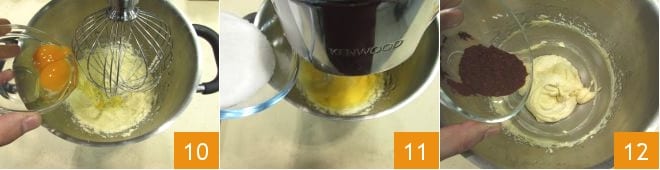 Añade en este punto los huevos uno por uno 10, luego cuando se hayan absorbido, vierte también la otra mitad del azúcar 11. Incorpora al bizcocho el cacao 12,