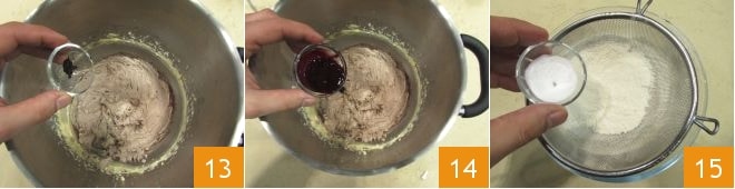 agrega también las semillas de la vaina de vainilla 13 y el colorante 14. Tamiza la harina y el bicarbonato 15