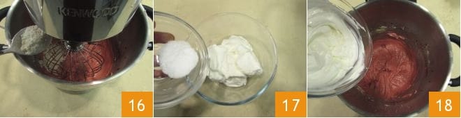 Luego incorpora las harinas a la mezcla una cucharada a la vez 16, continuando mezclando con las varillas hasta que se absorban por completo. Mientras tanto, en un bol pequeño mezcla el yogur con la sal 17 y agrégalo a la masa 18, mezclando con una espátula para integrarlo bien.