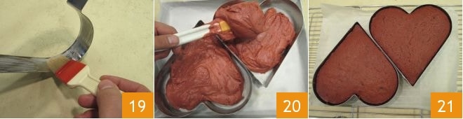 Unta con un pincel de cocina dos moldes sin fondo en forma de corazón de 20 cm 19. Coloca los moldes en una bandeja forrada con papel de horno y vierte la masa dentro 20, nivelándola con una espátula. Luego hornea en horno estático precalentado a 180° durante unos 25-30 minutos (160° durante 15-20 minutos si es horno ventilado). Cuando los corazones estén cocidos, sácalos del horno y déjalos enfriar completamente sobre una rejilla 21.