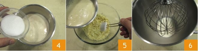 Añade el azúcar en grano 4, calienta nuevamente, mezcla y vierte la nata caliente sobre el chocolate blanco picado 5 y mezcla hasta que se disuelva por completo. Luego deja enfriar la mezcla, cubriendo con papel film en contacto. Monta la nata en un robot de cocina 6 o con una batidora eléctrica.