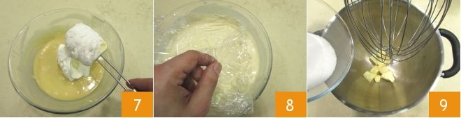 Incorpórala a la crema ya fría 7, luego cubre nuevamente con papel film 8 y deja en la nevera por 3 horas (mejor aún si es toda la noche) para que se endurezca. Mientras tanto dedica al bizcocho: en un robot de cocina vierte la mantequilla y la mitad del azúcar 9 y mezcla con la varilla hasta obtener una mezcla clara y espumosa.