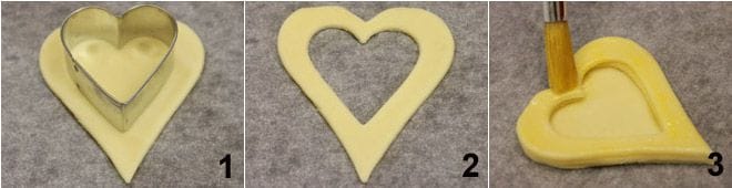 Para preparar los corazones de hojaldre, comenzad precalentando el horno a 200°, desenrollad el hojaldre y con un cortador en forma de corazón, sacad 24 corazones, 8 dejadlos enteros mientras que los otros 16 perforadlos con un cortador en forma de corazón de menor tamaño (1-2). Superponed dos corazones perforados sobre cada corazón completo, teniendo cuidado de untar la superficie de cada capa para que los bordes se adhieran bien 3. Untad también bien la última capa de hojaldre e introducid los corazones en el horno durante unos 10 minutos. Sacad los corazones de hojaldre y dejad enfriar todo en una rejilla. Ahora ha llegado el momento de decorar vuestros corazones: aquí tenéis nuestras sugerencias (las dosis indicadas para cada relleno son suficientes para 4 corazones).