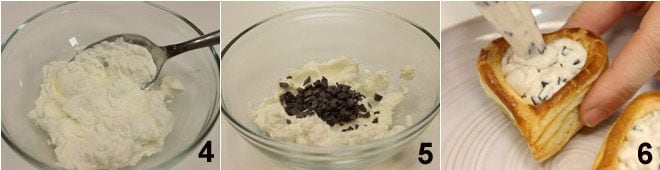 Para el relleno con ricotta y chocolate, batid la ricotta con el azúcar glas y la cucharadita de nata 4 hasta obtener una mezcla cremosa, en este punto añadid las virutas de chocolate 5 mezclando bien. Rellenad los corazones con la crema de ricotta y chocolate 6 y cubridlos con las virutas de chocolate que habéis reservado.