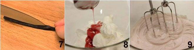 Para el relleno de guindas y chantilly, comenzad preparando la chantilly con los ingredientes indicados anteriormente y Crema Chantilly para el procedimiento 7. Una vez lista, añadid 4 cucharadas del jarabe de las guindas 8, continuando montando la crema 9 y rellenad los corazones. Para completar la obra, cortad por la mitad las guindas (o si preferís dejadlas enteras) y colocadlas sobre cada corazón para decorar. ¡Feliz San Valentín!