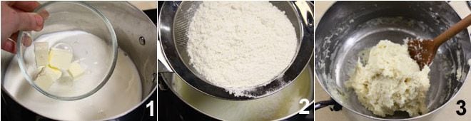 Para preparar la masa de los corazones, verted la leche en una cacerola, añadid la mantequilla y la sal 1 y llevad a punto de ebullición; quitad la cacerola del fuego y añadid inmediatamente la harina, toda de una vez 2. Con la ayuda de una cuchara de madera, mezclad con vigor hasta amalgamar los ingredientes 3 y obtener una mezcla bastante compacta (si la veis grumosa, no os preocupéis).