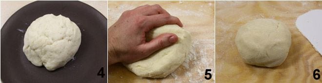Dejad que la masa obtenida se temple 4, luego trasladadla a una superficie ligeramente enharinada y amasad con las manos 5 hasta obtener una masa lisa y homogénea 6.