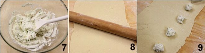 Extendéis la masa de los corazones con un rodillo 8 formando una lámina rectangular con un grosor de aproximadamente 1-2 mm como máximo: con una cucharita, tomad un poco del relleno y colocadlo en montoncitos sobre la lámina, 9 a una distancia de unos 10 cm entre sí.