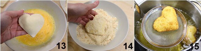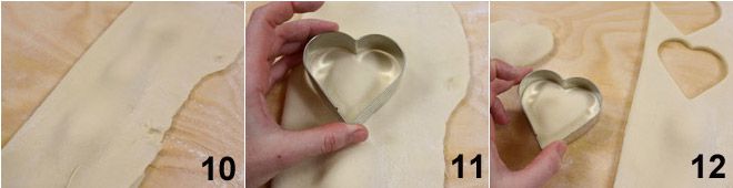Cubrid los montoncitos con la masa (cerrándola como un libro) 10 y con el corta galletas en forma de corazón recortad las figuras. (11-12) Proceded de este modo, amasando cada vez los recortes hasta agotar los ingredientes. Una vez obtenidas todas las figuras, tomad dos platos: en uno pondréis el pan rallado y en el otro el huevo batido.