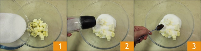 Para preparar los cupcakes de Navidad, coloca la mantequilla ablandada en un bol, añade el azúcar 1, una pizca de sal 2 y el extracto de vainilla 3.
