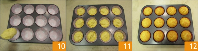 Forra una bandeja de muffin de 12 con los moldes de papel, luego llénalos con aproximadamente 50 g de masa cada uno ayudándote con una cuchara 11 12. Antes de hornear, golpea varias veces la bandeja en la mesa de trabajo, de esta manera nivelarás cuidadosamente la superficie y obtendrás cupcakes hinchados pero con la superficie plana. Hornea en horno caliente a 180° durante unos 25-30 minutos, luego procede con la segunda hornada: con estas dosis obtendrás aproximadamente 24 cupcakes. Una vez cocidos, déjalos enfriar a temperatura ambiente antes de decorarlos 12.