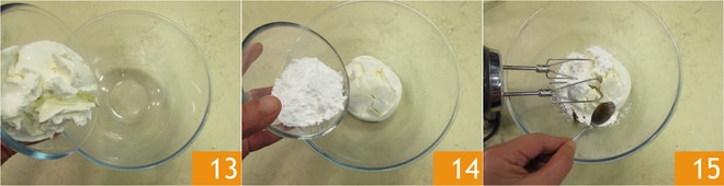 Ahora trabaja el mascarpone con las varillas eléctricas 13 junto con el azúcar 14 y el extracto de vainilla 15.