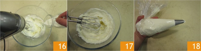 Vierte la nata 16 hasta obtener una crema montada 17. Transfiere la crema a una manga pastelera con boquilla de estrella 18 y colócala en la nevera.