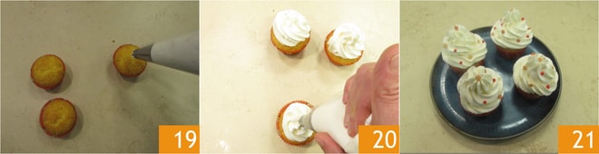 Recupera los cupcakes ya fríos 19 y decóralos con el frosting 20. Adorna con fideos de colores y sirve tus cupcakes de Navidad 21!