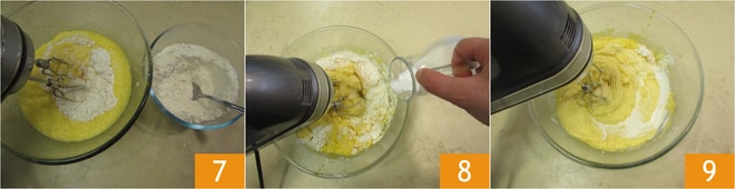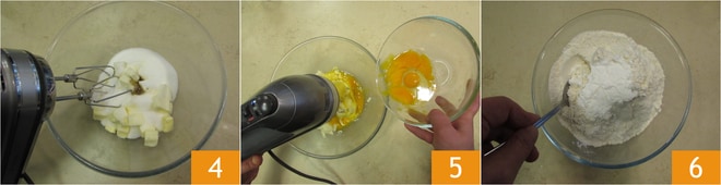 Acciona las varillas a velocidad media-alta 4 y deja que la mezcla se monte ligeramente. Después de unos minutos, añade los huevos poco a poco 5, continuando con las varillas. Tamiza las harinas en un bol 6.
