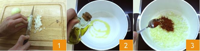 Para preparar los currywurst, comience con la salsa de acompañamiento: pique la cebolla muy finamente 1 en una sartén, vierta un poco de aceite y deje que la cebolla se ablande 2, cuando esté blanda, agregue también el pimentón 3.