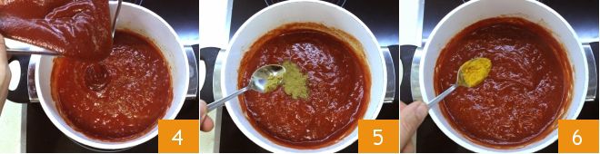 Luego vierta el puré de tomate 4 y el kétchup y deje que la salsa hierva a fuego lento. Por último, incorpore también el comino 5 y el curry 6.