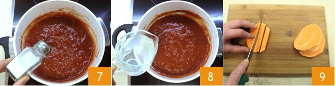 Ajuste de sal 7 y agregue un par de cucharones de agua caliente 8. Continúe la cocción hasta que la salsa se haya espesado, luego apague el fuego y reserve la salsa. Ocúpese de la preparación del acompañamiento: pele las batatas y córtelas en bastones de aproximadamente 1 cm y medio de ancho y 8-9 cm de largo 9.