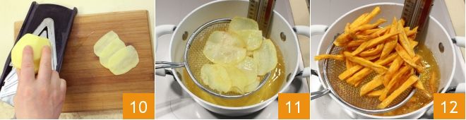Pele también las patatas amarillas y córtelas en chips finas con una mandolina 10. Caliente el aceite de semillas y fría separadamente las chips de patatas amarillas 11 y los bastones de batatas 12, asegurándose de mantener una temperatura de aproximadamente 170°-180° para una fritura óptima,