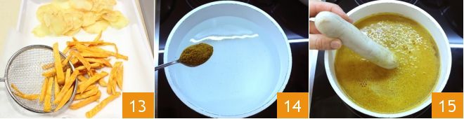 luego escurra las patatas fritas con una espumadera y colóquelas en una bandeja cubierta con papel absorbente 13. Dedíquese a la cocción de las salchichas: lleve a ebullición abundante agua en la que haya disuelto una cucharada de curry 14, sumerja las salchichas 15 y hiérvalas durante unos 5 minutos, luego escúrralas
