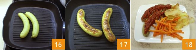 y páselas por la plancha caliente por ambos lados para que se doren bien (16-17). Sirva los currywurst bien calientes acompañados de la salsa y abundantes patatas fritas 18. ¡Guten Appetit!