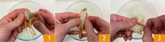 Para preparar el cuscús con calabacines y gambas, primero limpia las gambas: separa la cabeza 1, luego quita el caparazón 2 y el intestino 3.