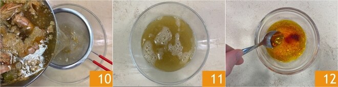 Pasado el tiempo de cocción, filtra el caldo 10 y pesa 300 g, que te servirán para el cuscús 11. Ahora disuelve el azafrán en un poco de agua tibia 12.