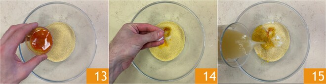 Vierte el cuscús en un bol grande, luego añade el azafrán disuelto 13, la sal 14 y los 300 g de caldo caliente 15.