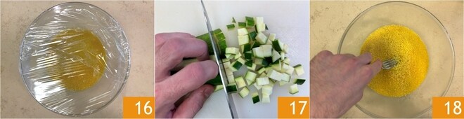 Cubre el bol con film transparente 16 y deja reposar durante 5 minutos. Mientras tanto, corta los calabacines en dados 17. Pasado el tiempo de reposo del cuscús, desmenúzalo con un tenedor 18.