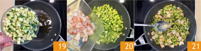 En una sartén, dora un poco de aceite con un diente de ajo, luego añade los calabacines 19, salpimenta. Cocina a fuego medio durante 15 minutos, luego añade las gambas 20. Continúa la cocción durante otros 5 minutos, después elimina el ajo 21.