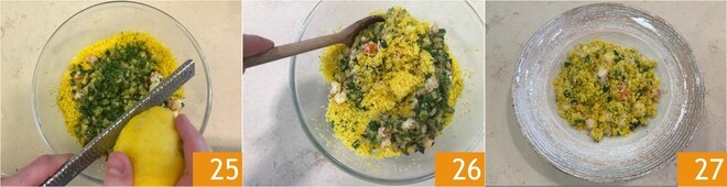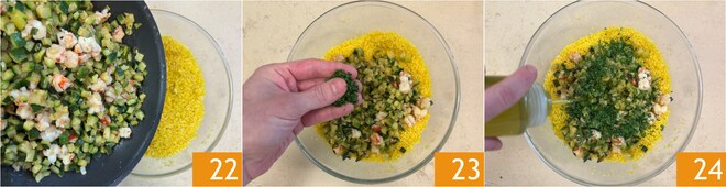 En este punto, vierte los calabacines y las gambas en el bol con el cuscús 22, luego aliña con el perejil picado 23 y un chorrito de aceite 24.