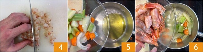 Guarda los restos a un lado y corta la carne en trozos 4. En una cacerola calienta un poco de aceite y añade la zanahoria, el apio y la cebolla que habrás cortado groseramente 5. Añade también los restos de las gambas 6.