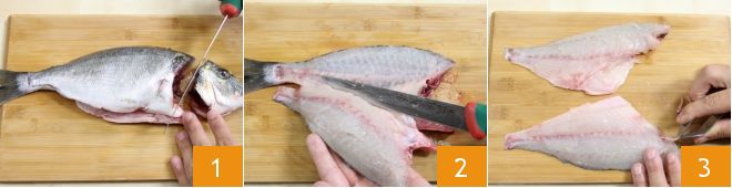 Para preparar el cuscús con verduras y albóndigas de pescado, comienza cociendo una patata. Luego, dedícate a limpiar la dorada: para realizar esta operación delicada de la mejor manera, consulta nuestra Escuela de cocina: Cómo limpiar la dorada. Después de eviscerar y escamar la dorada, elimina también las branquias. Provisiónate de un cuchillo para filetear pescado e incide la cabeza, eliminándola 1. Continua haciendo un corte en la cola y en la parte dorsal del pescado a lo largo de la columna vertebral: comienza desde lo alto y procede moviendo la hoja, horizontalmente respecto al plano de trabajo, para obtener el primer filete 2. Separa las dos mitades del pescado y continúa de la misma manera, despegando la carne de la espina para obtener el segundo filete (al realizar esta operación ten cuidado de no quitar demasiada pulpa). Elimina todas las posibles espinas presentes utilizando unas pinzas 3, ayúdate pasando después una mano sobre la pulpa para identificarlas, luego quita la piel utilizando con cuidado el cuchillo, para no desperdiciar la carne del pescado.